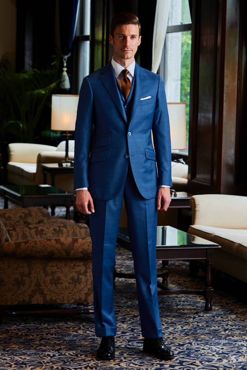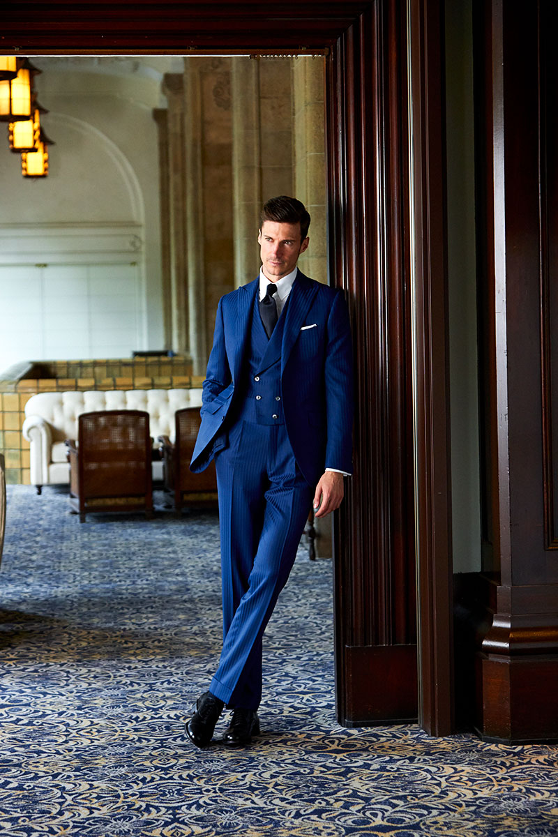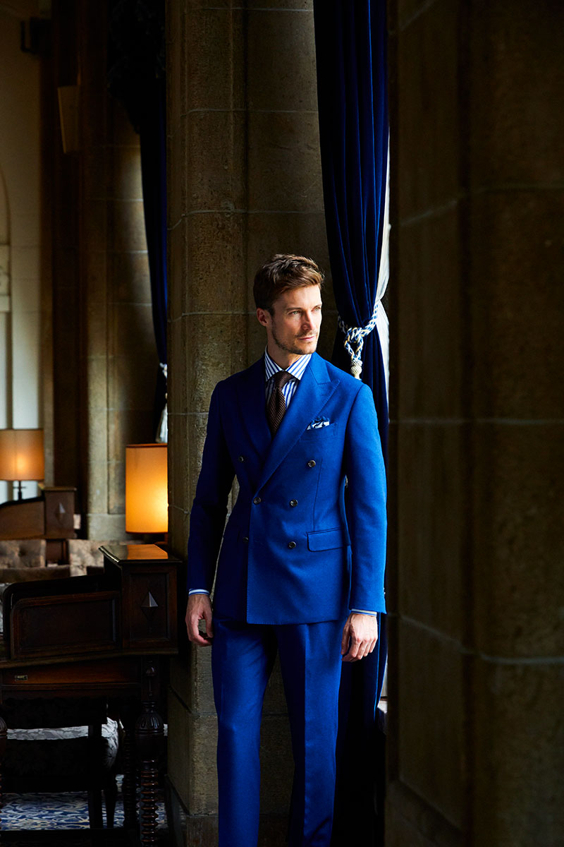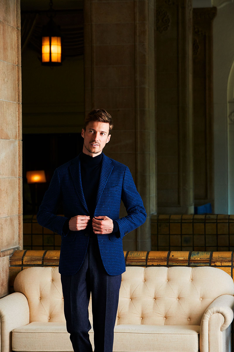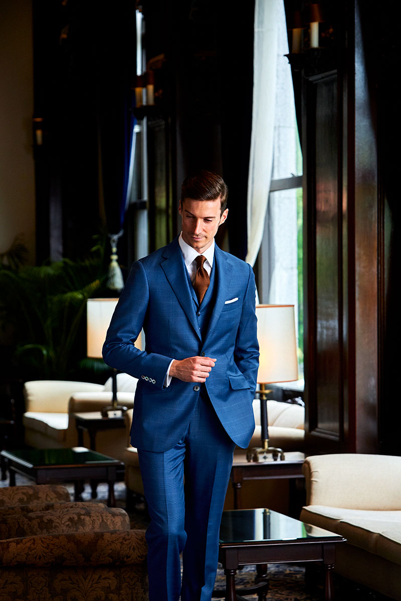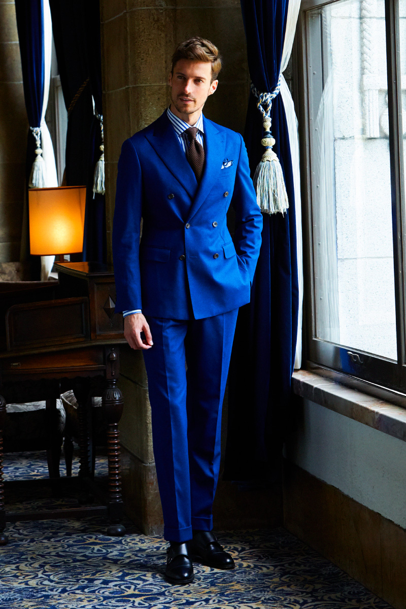 ファッションにおいて秋冬はトーンを抑えたダークネイビーやミッドナイトブルーを選ぶのがセオリーとされていますが、ロイヤルブルーやサファイアブルーなどトーンの明るいものを敢えてチョイスし、ブルーのバリエーションを広げることにより、大人の男性の余裕と色気を表現しています。