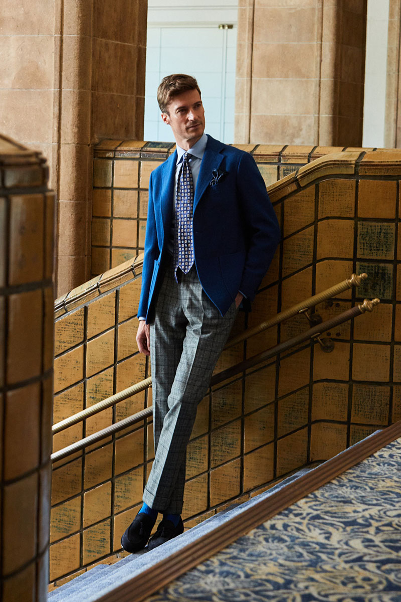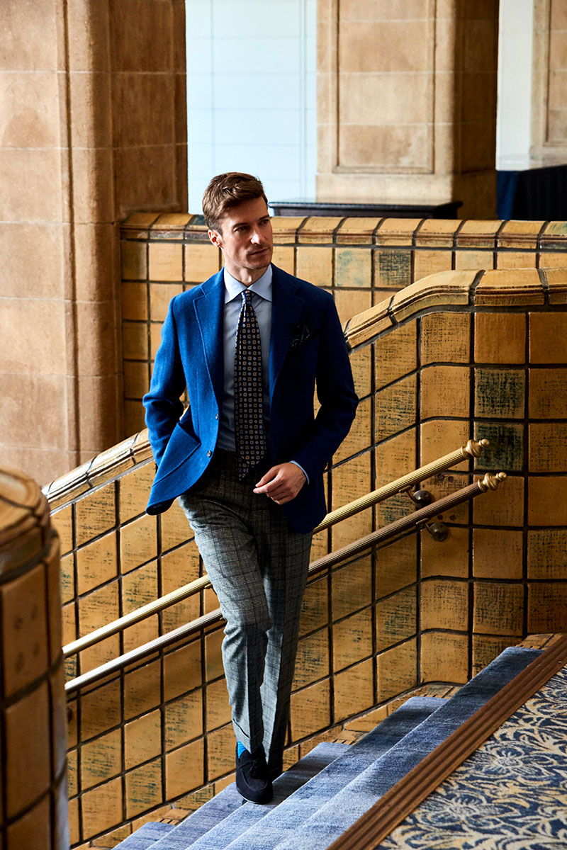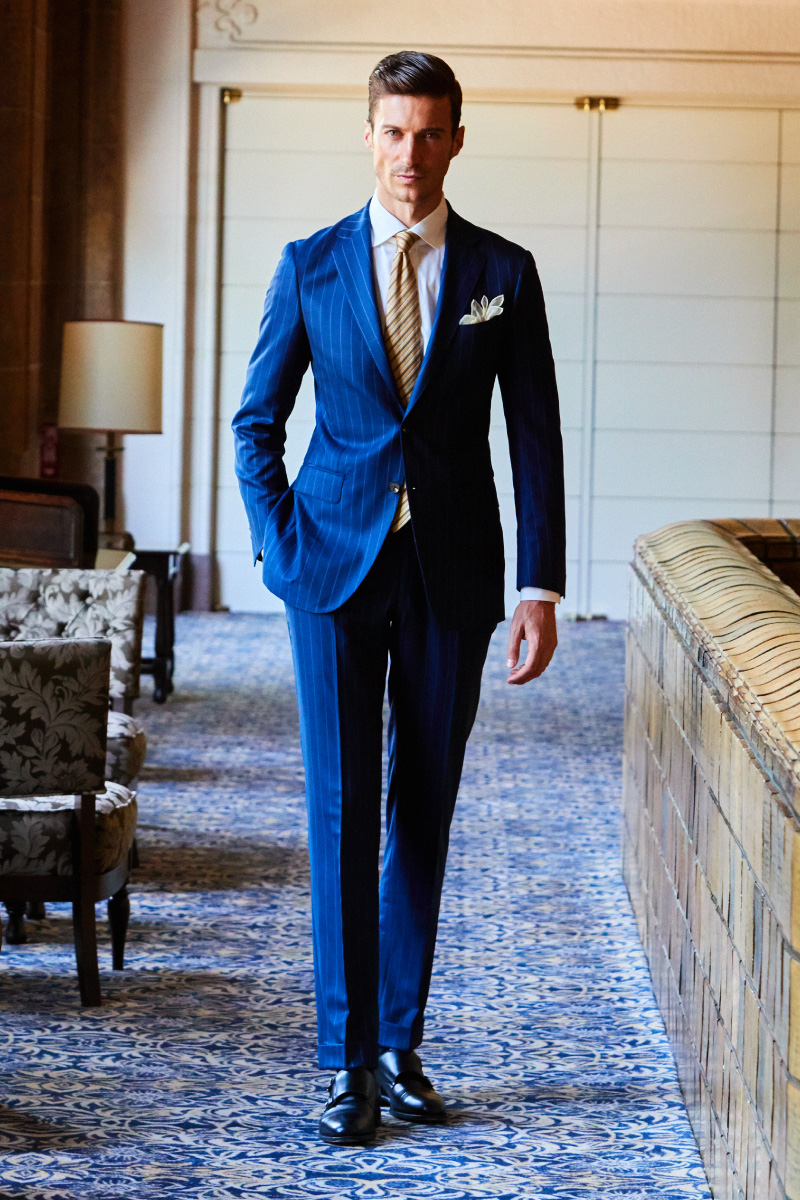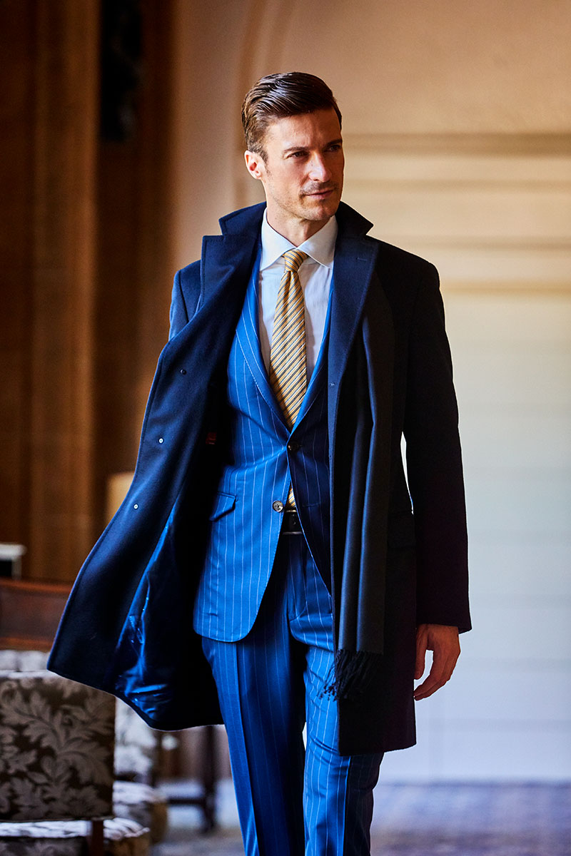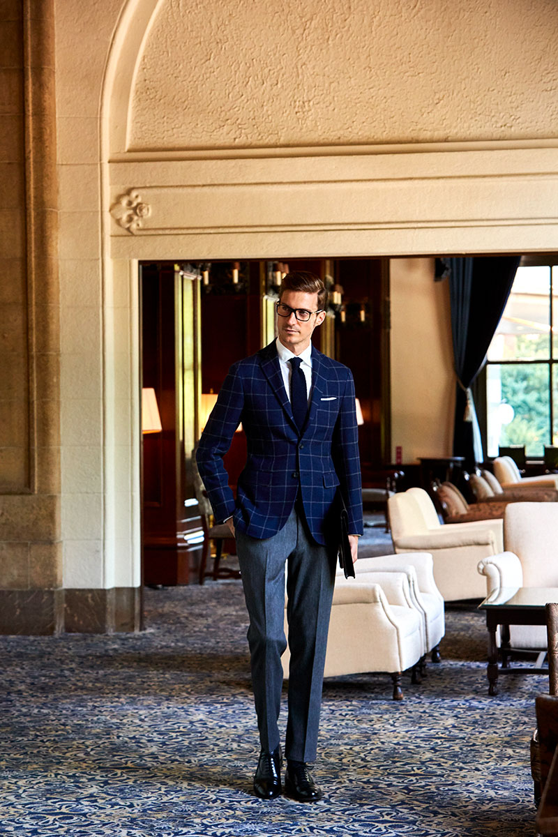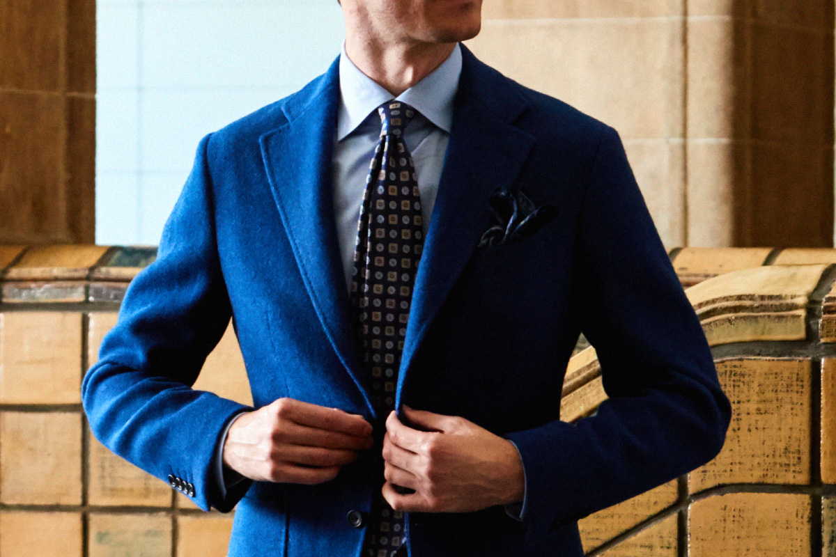 ファッションにおいて秋冬はトーンを抑えたダークネイビーやミッドナイトブルーを選ぶのがセオリーとされていますが、ロイヤルブルーやサファイアブルーなどトーンの明るいものを敢えてチョイスし、ブルーのバリエーションを広げることにより、大人の男性の余裕と色気を表現しています。