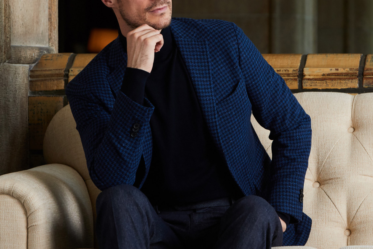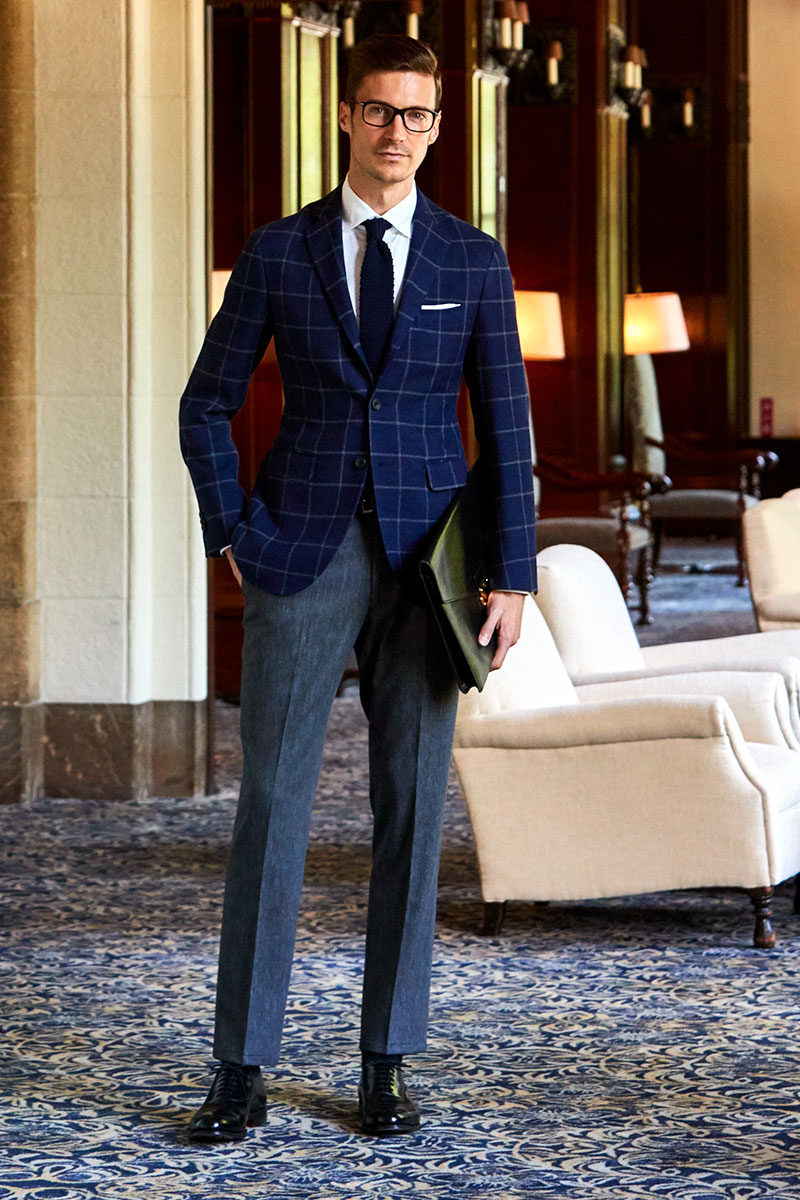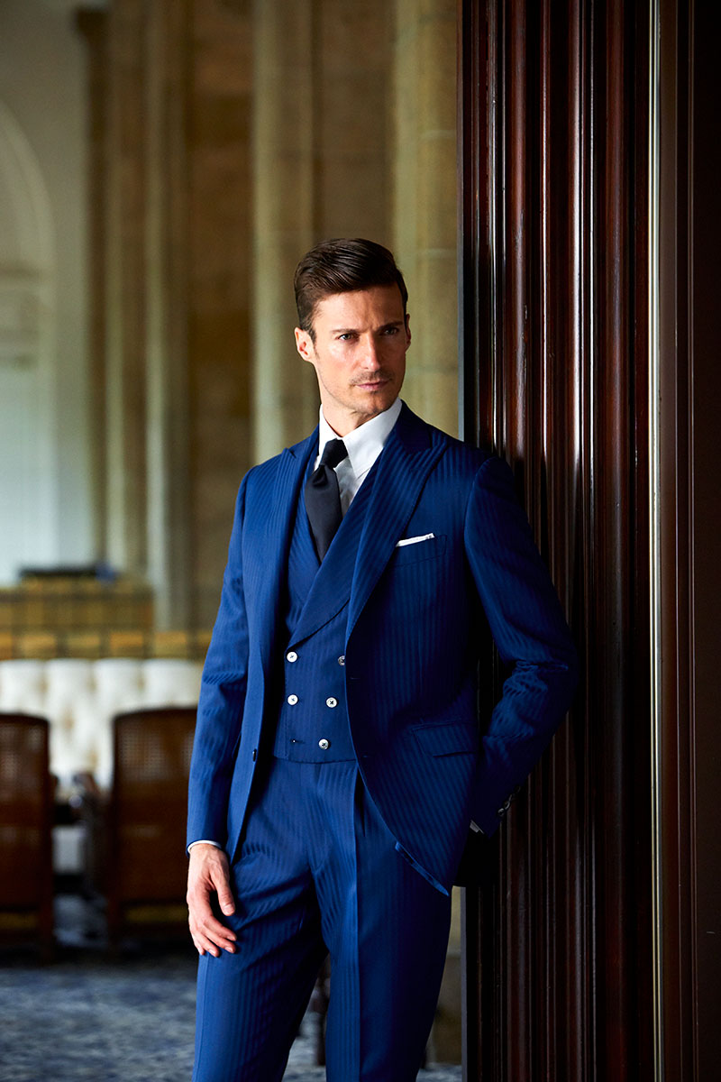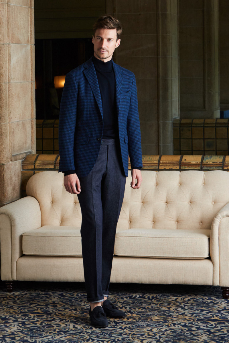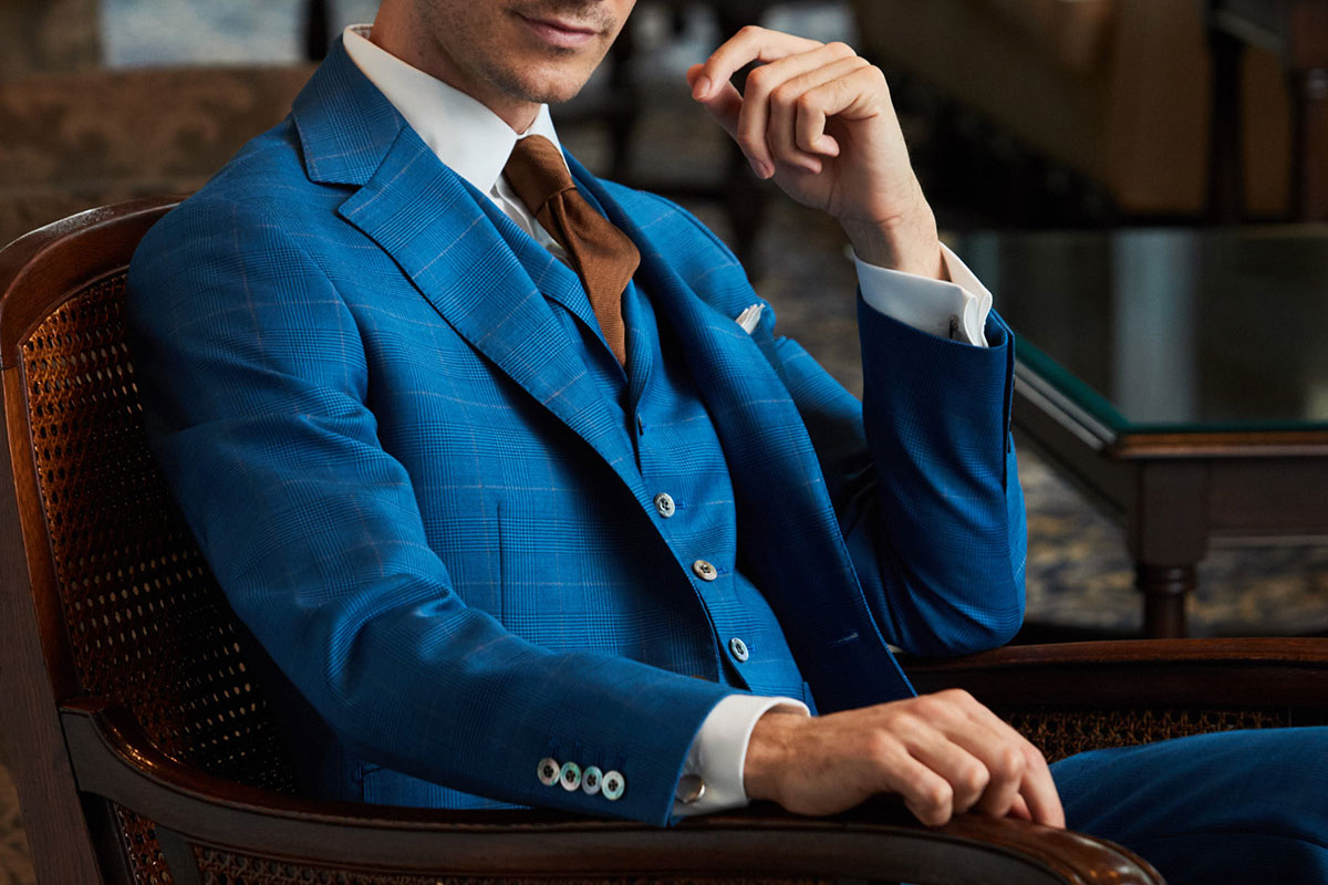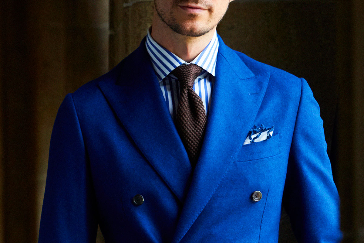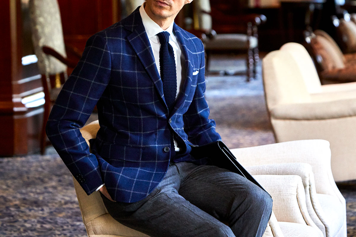 ファッションにおいて秋冬はトーンを抑えたダークネイビーやミッドナイトブルーを選ぶのがセオリーとされていますが、ロイヤルブルーやサファイアブルーなどトーンの明るいものを敢えてチョイスし、ブルーのバリエーションを広げることにより、大人の男性の余裕と色気を表現しています。