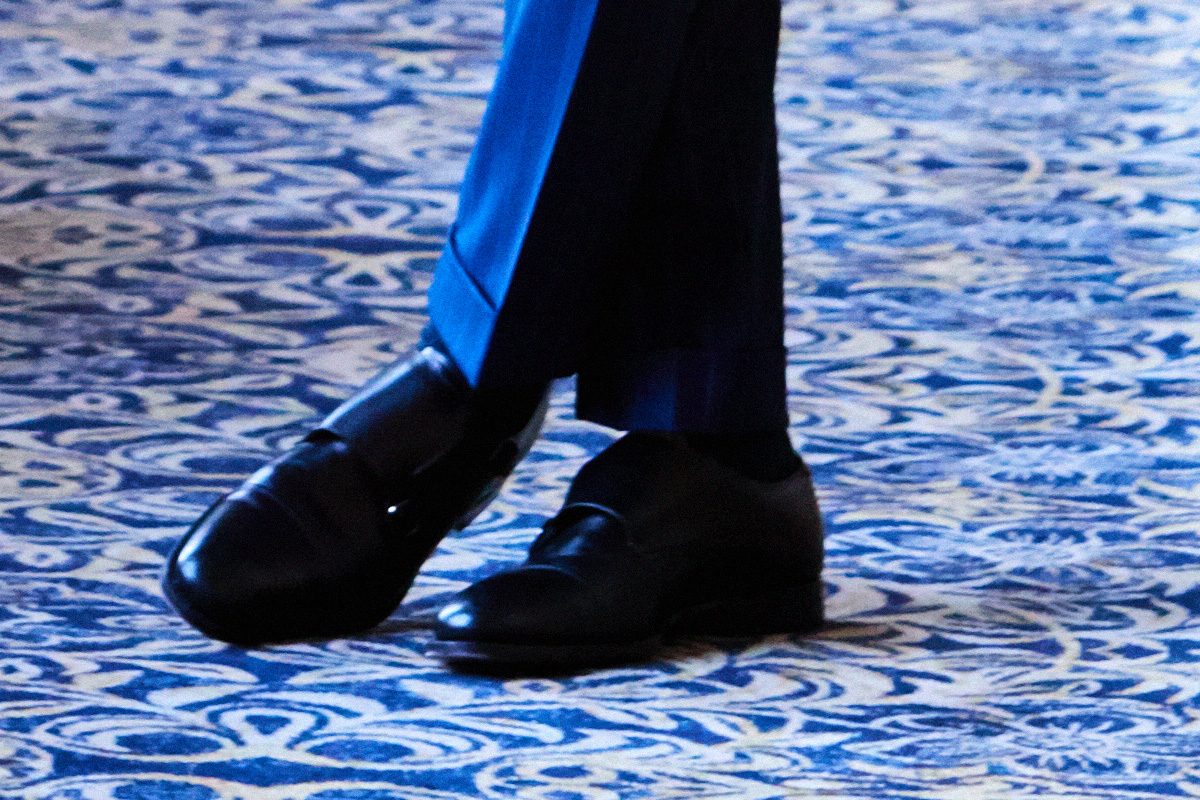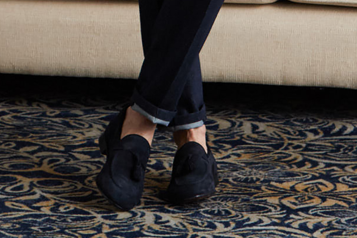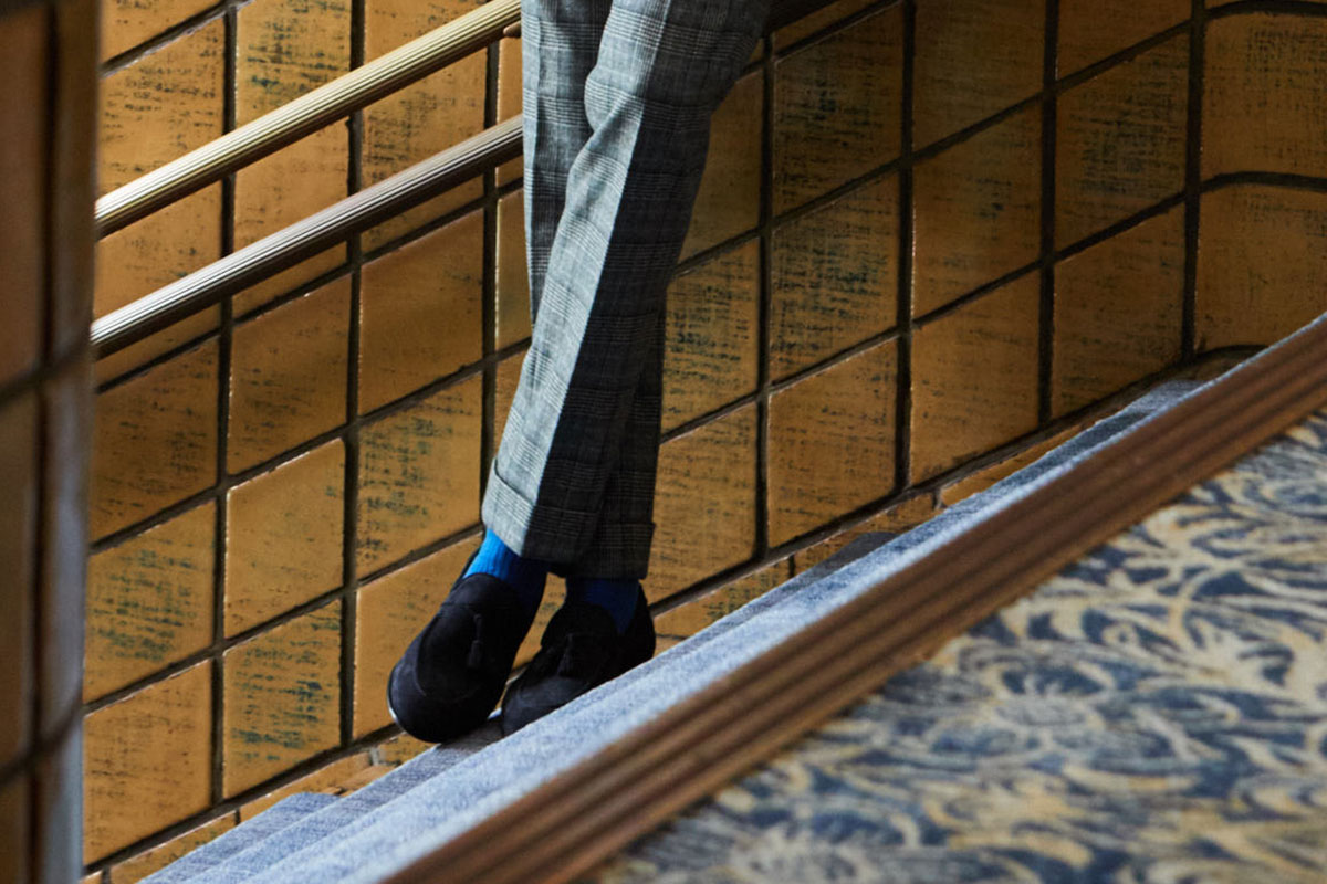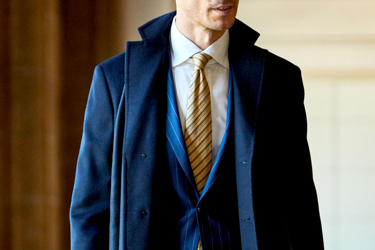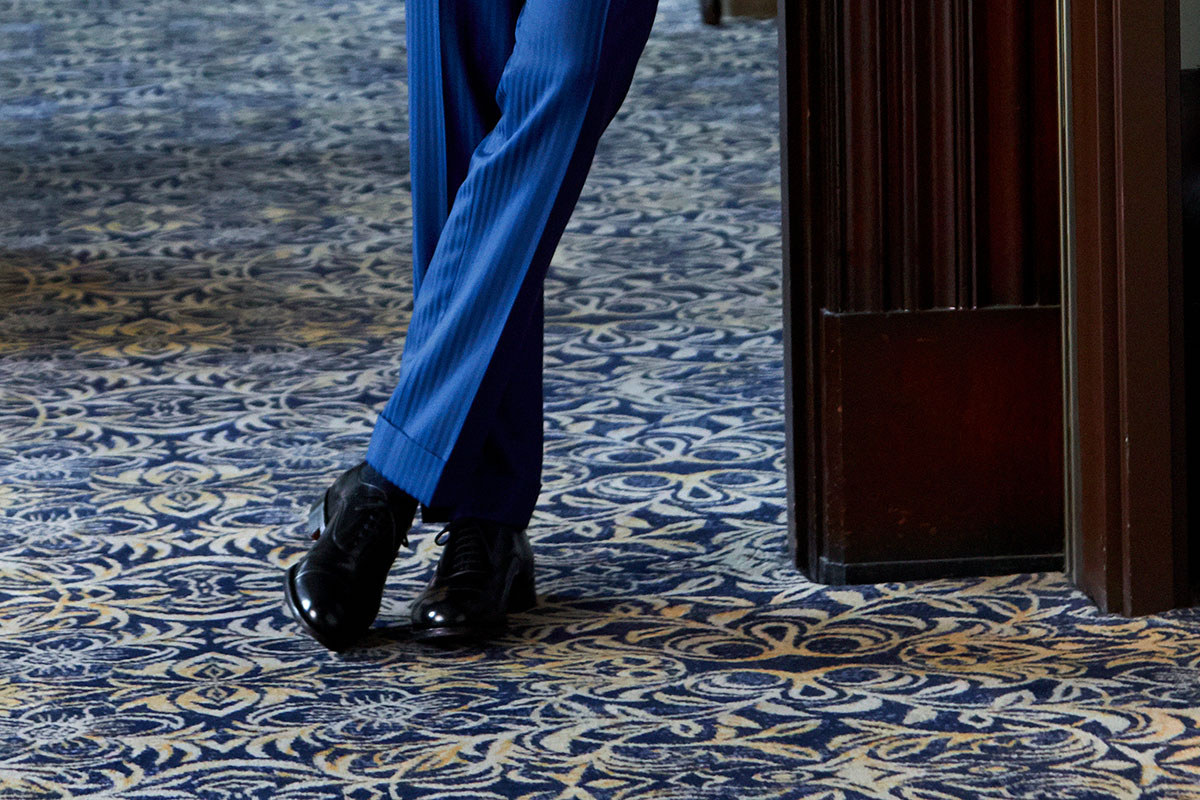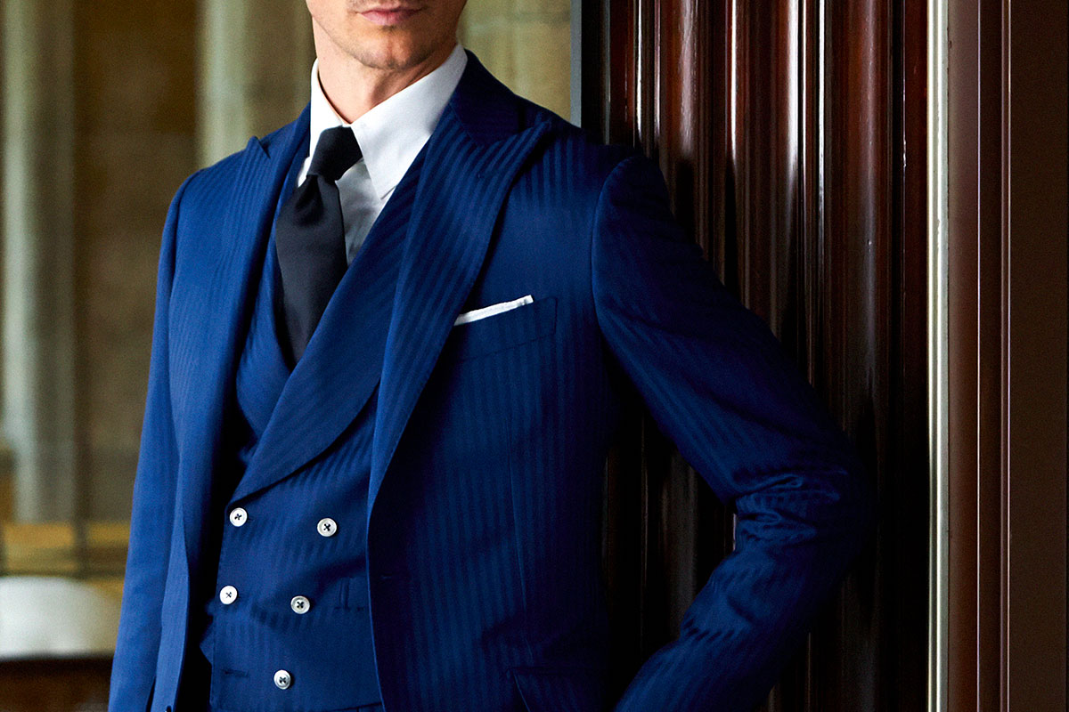 ファッションにおいて秋冬はトーンを抑えたダークネイビーやミッドナイトブルーを選ぶのがセオリーとされていますが、ロイヤルブルーやサファイアブルーなどトーンの明るいものを敢えてチョイスし、ブルーのバリエーションを広げることにより、大人の男性の余裕と色気を表現しています。