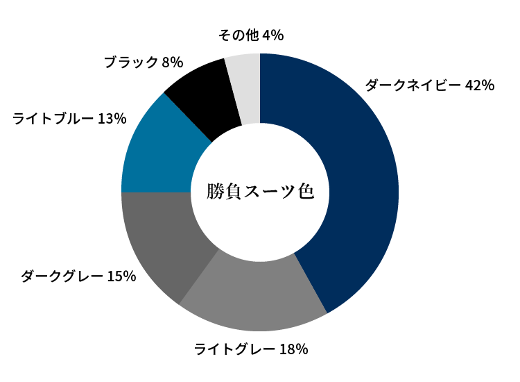ダークネイビー42%、ブルー13%と「青」系素材だけで55%という圧倒的な支持を獲得。ここぞという場面でネイビースーツは頼りになる欠かせない存在だ。