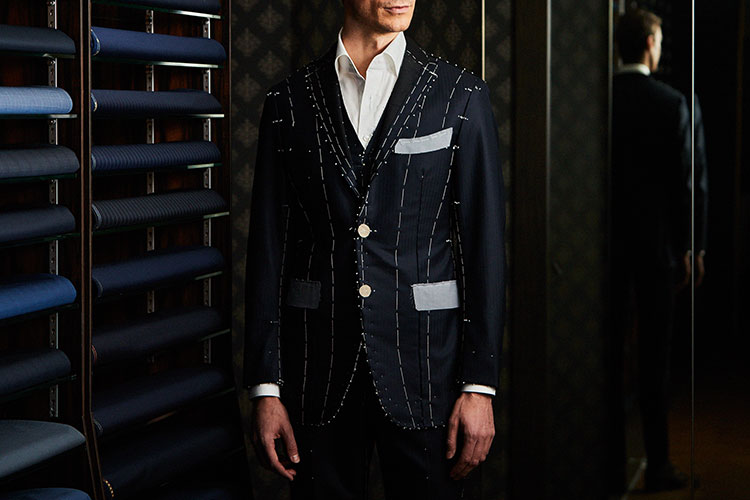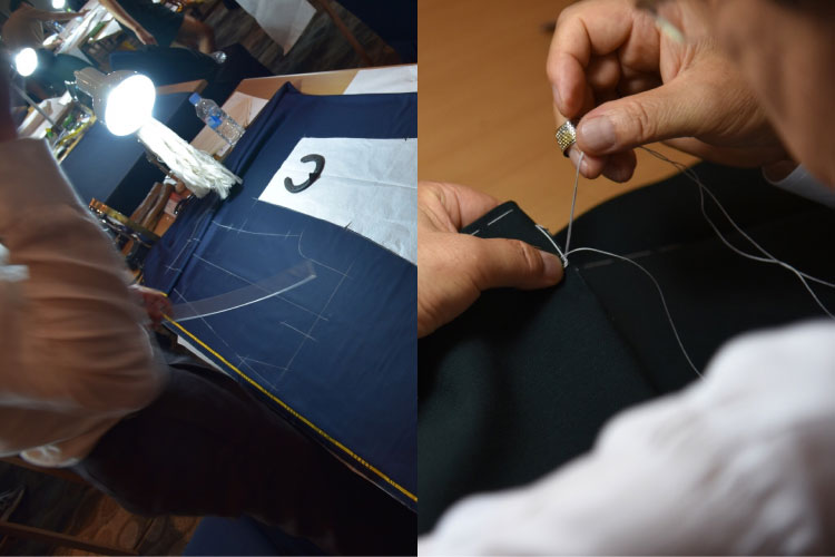 完璧な採寸データが完成したら、職人がその寸法を型紙へと落とし込み、生地のカッティングへと移ります。そしてできた各パーツは一つ一つ、職人による手作業の縫い合わせを経て、仮縫いの状態が完成します